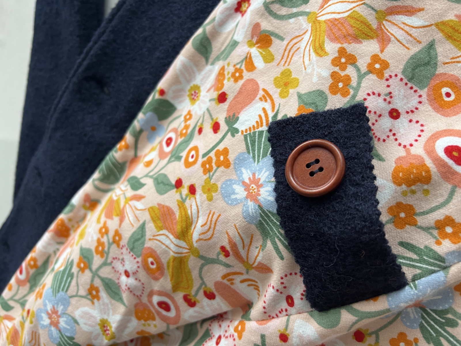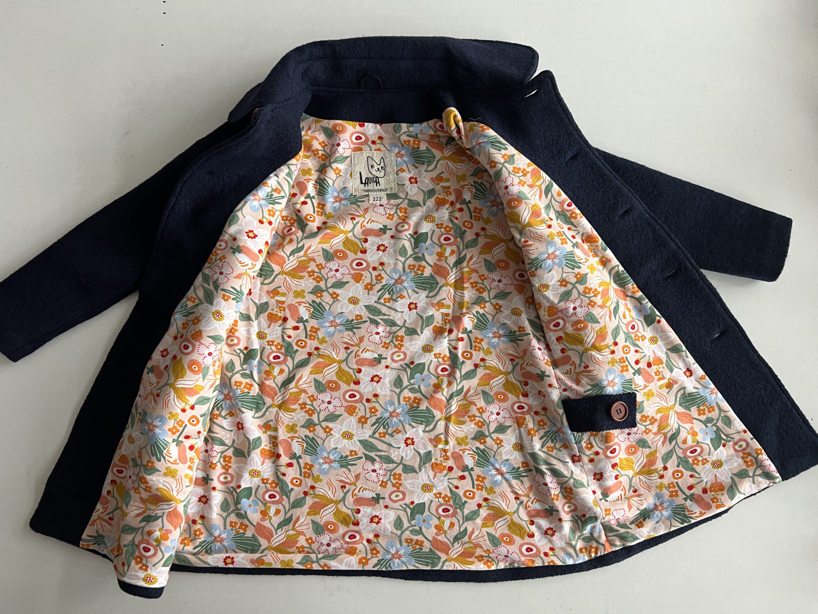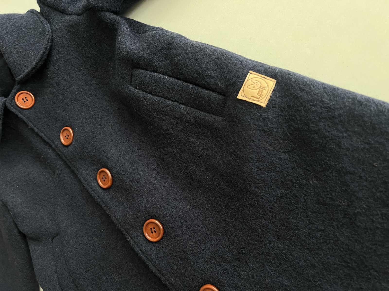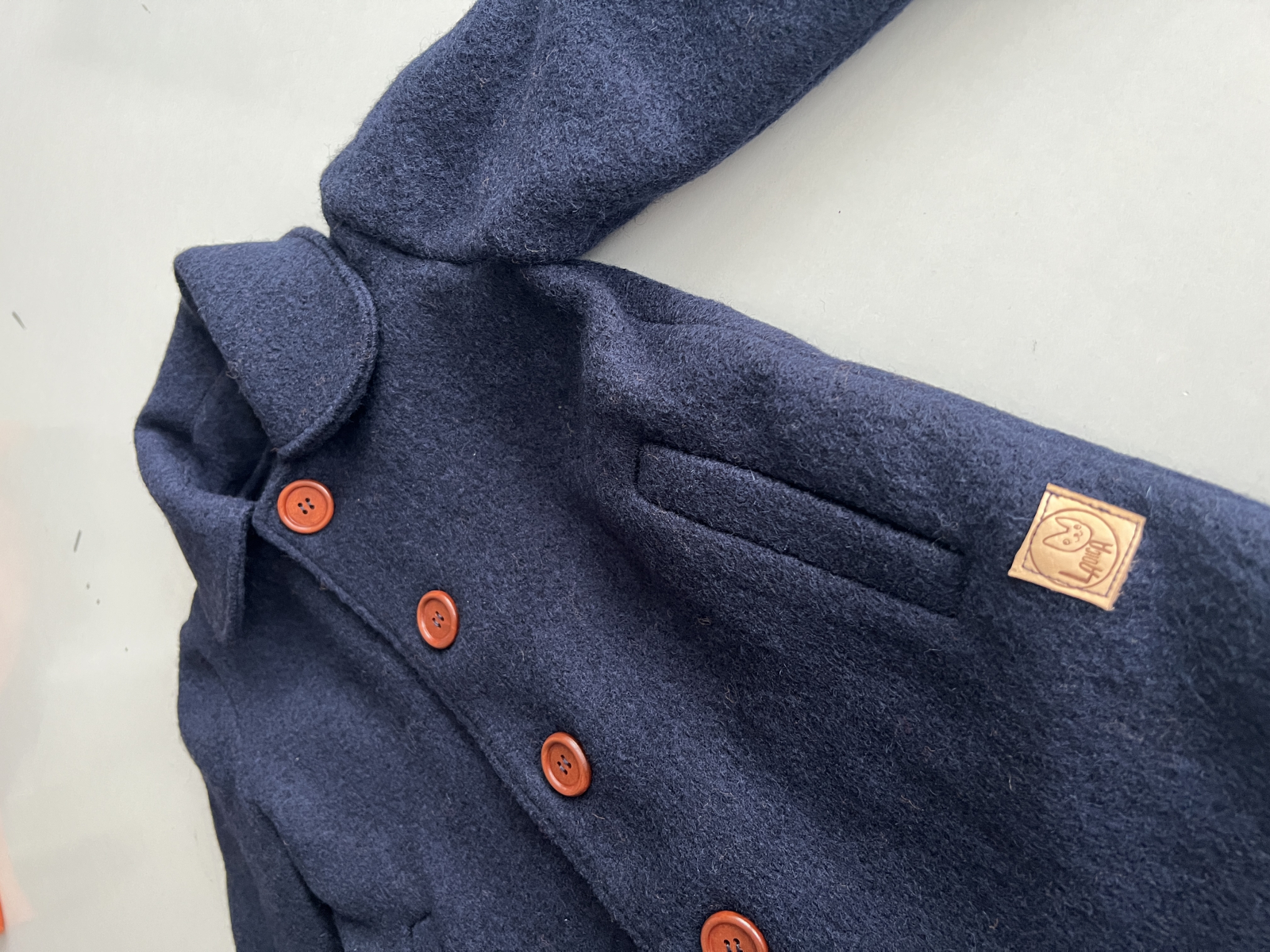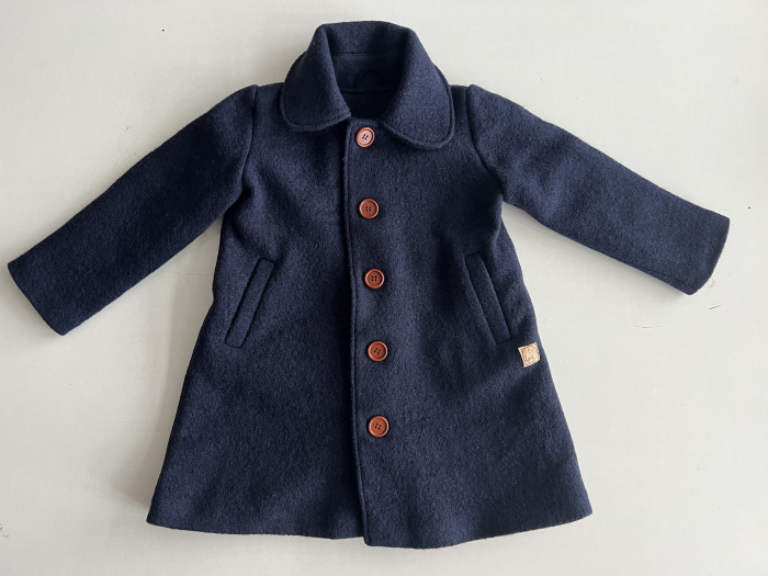 Palton clasic din lână fiartă călduros și confortabil. Este lung, dar nu atât de lung încât să îngreuneze joaca. Este dublat cu bumbac organic gros. Închiderea se realizează cu nasturi de lemn. Respinge umezeala și protejează de vânt. Se poate purta peste un pulover de lână.